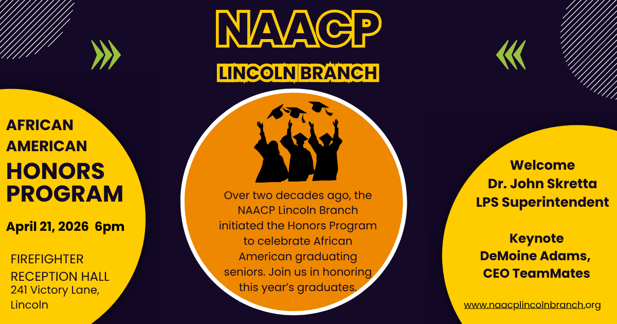 This year’s NAACP’s African American Honors Program will be held on April 21 at 6pm at the Firefighters Reception Hall, 241 Victory Lane in Lincoln. Started over twenty years ago by the NAACP, Lincoln Branch in collaboration with Lincoln Public Schools, the NAACP Honors Program recognizes African American graduating high school students with a grade point average of 3.0 or higher.